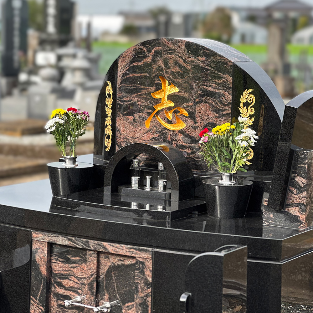 石材はクンナムとインドオーロラが使用されています。Kan [寛]と名づけられたこの墓石は、2トーンカラーの竿石と左右非対称のスタイリッシュなフォルムが特徴で、エレガントさと高級感あふれるお墓をお求めの方におすすめです。寛容さあふれる故人様への深い敬意を表現しています。穏やかな美しさと品格があり、ご家族との心温まるひとときを共に過ごす場となりますように。
