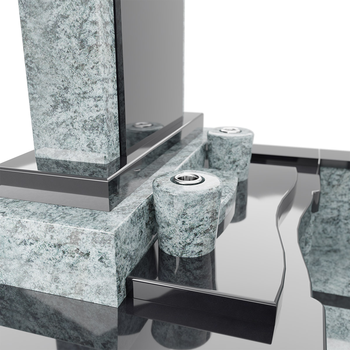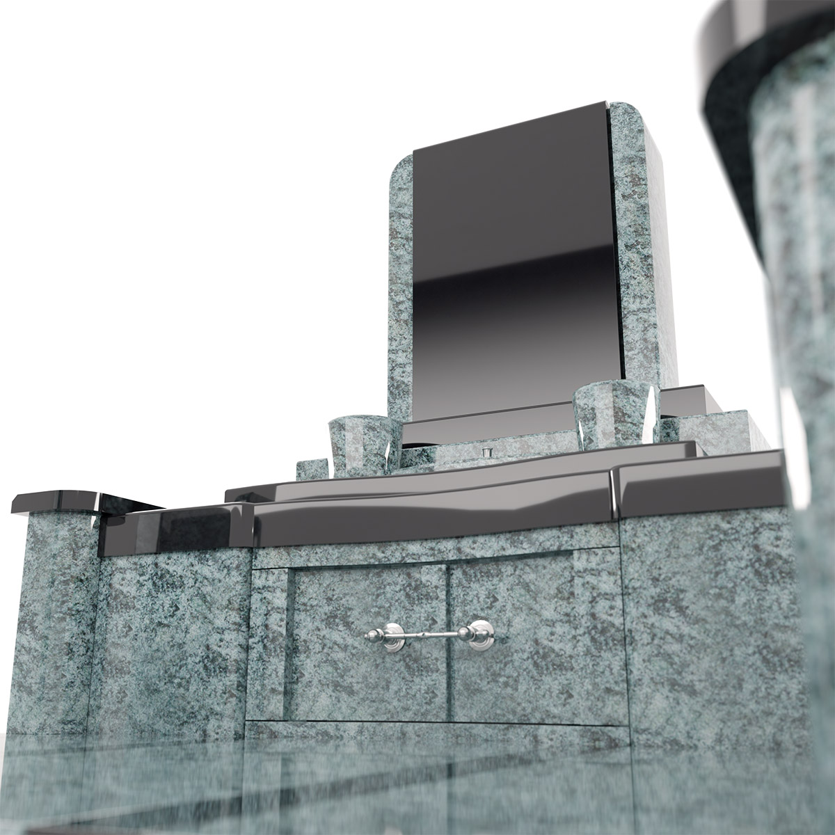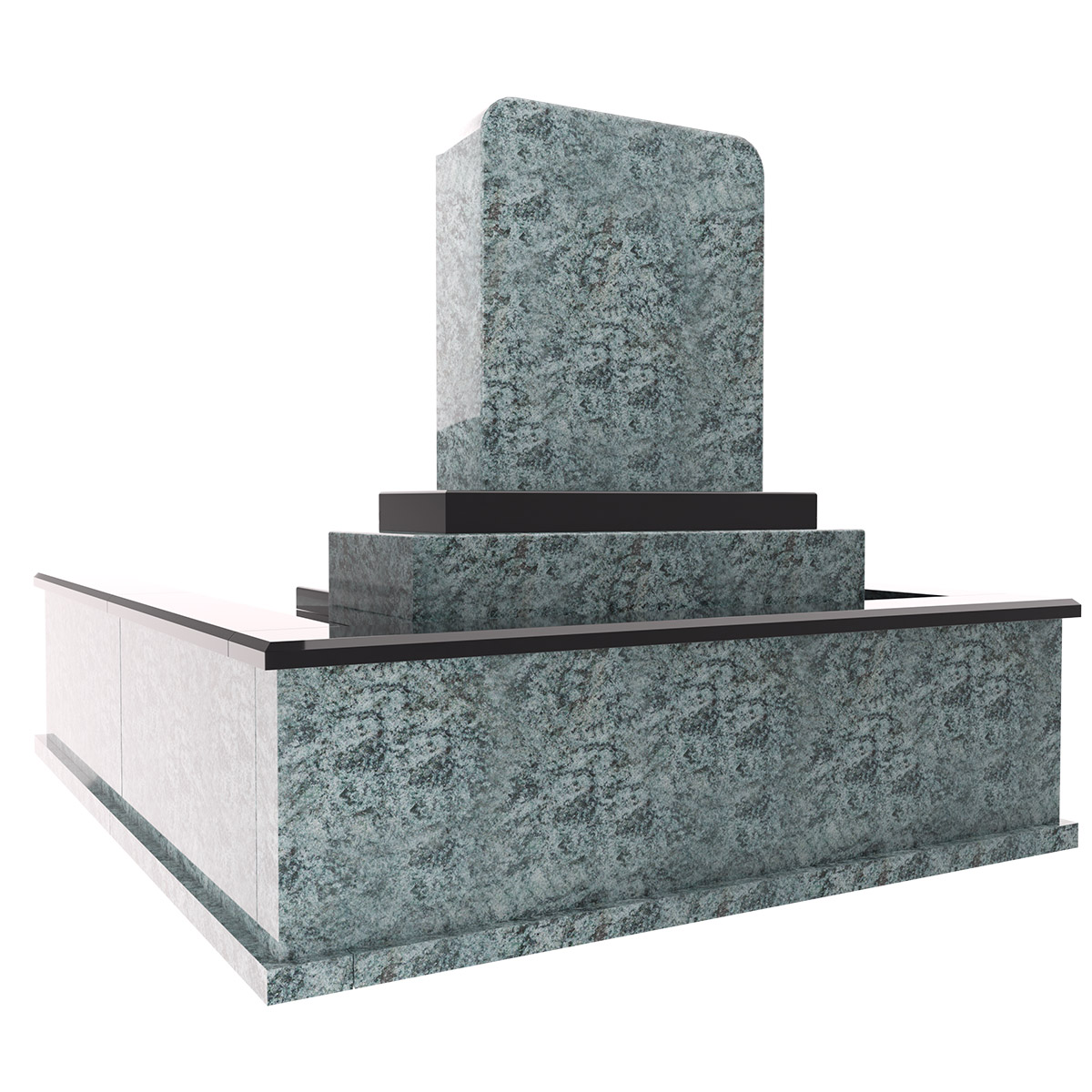 石材はクンナムとオリーブグリーンを使用しています。このデザイン墓石は愛情を象徴する名のように、外観も温かみと優雅さに満ちています。オリーブグリーンの高級感ある模様と黒のコントラストが調和し、床面にあしらわれた2本のラインはスタイリッシュでエレガントな墓石を演出します。