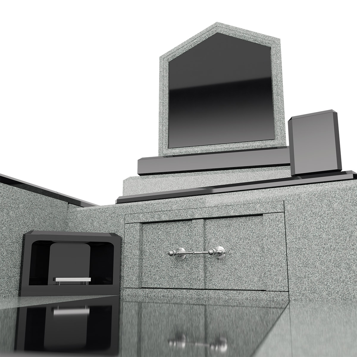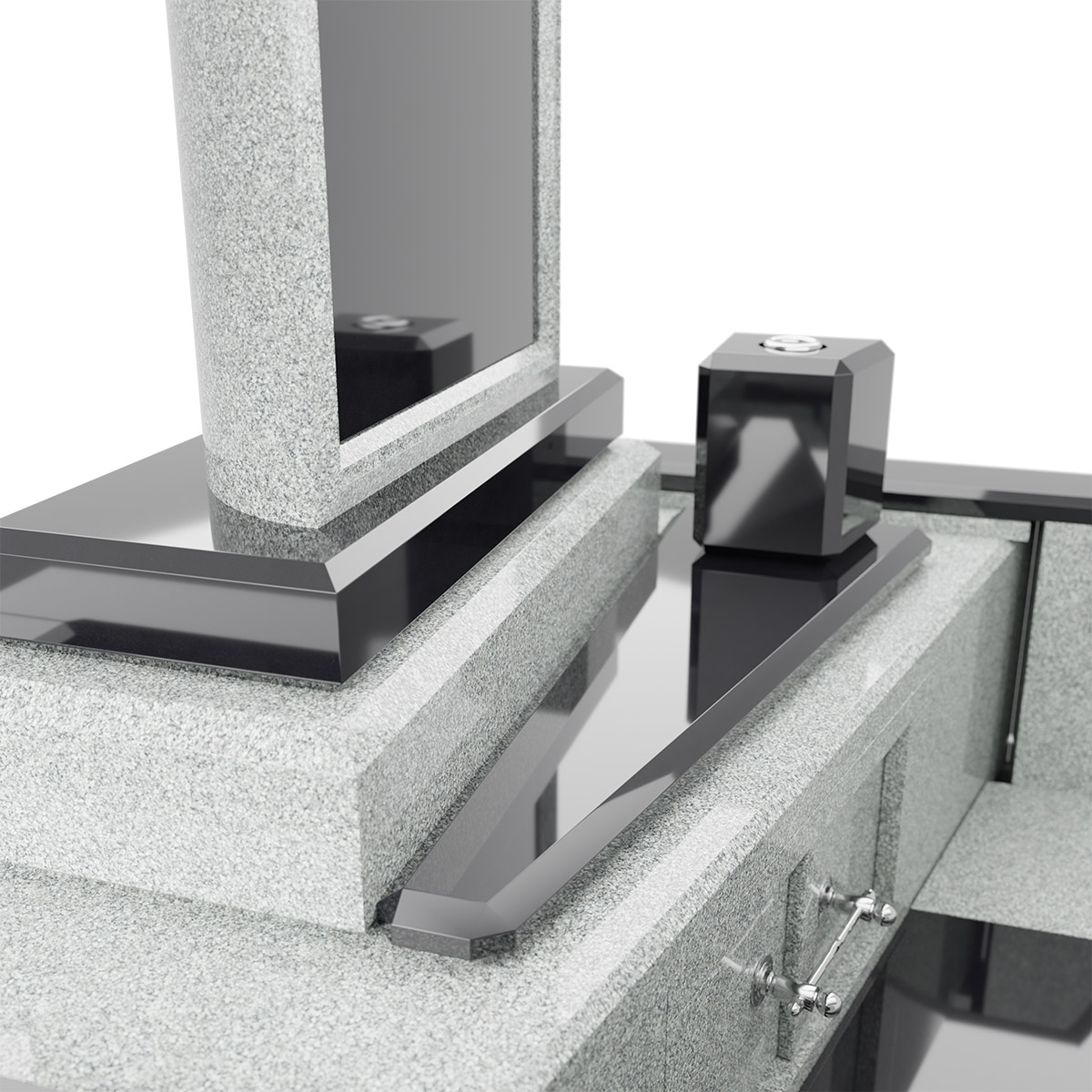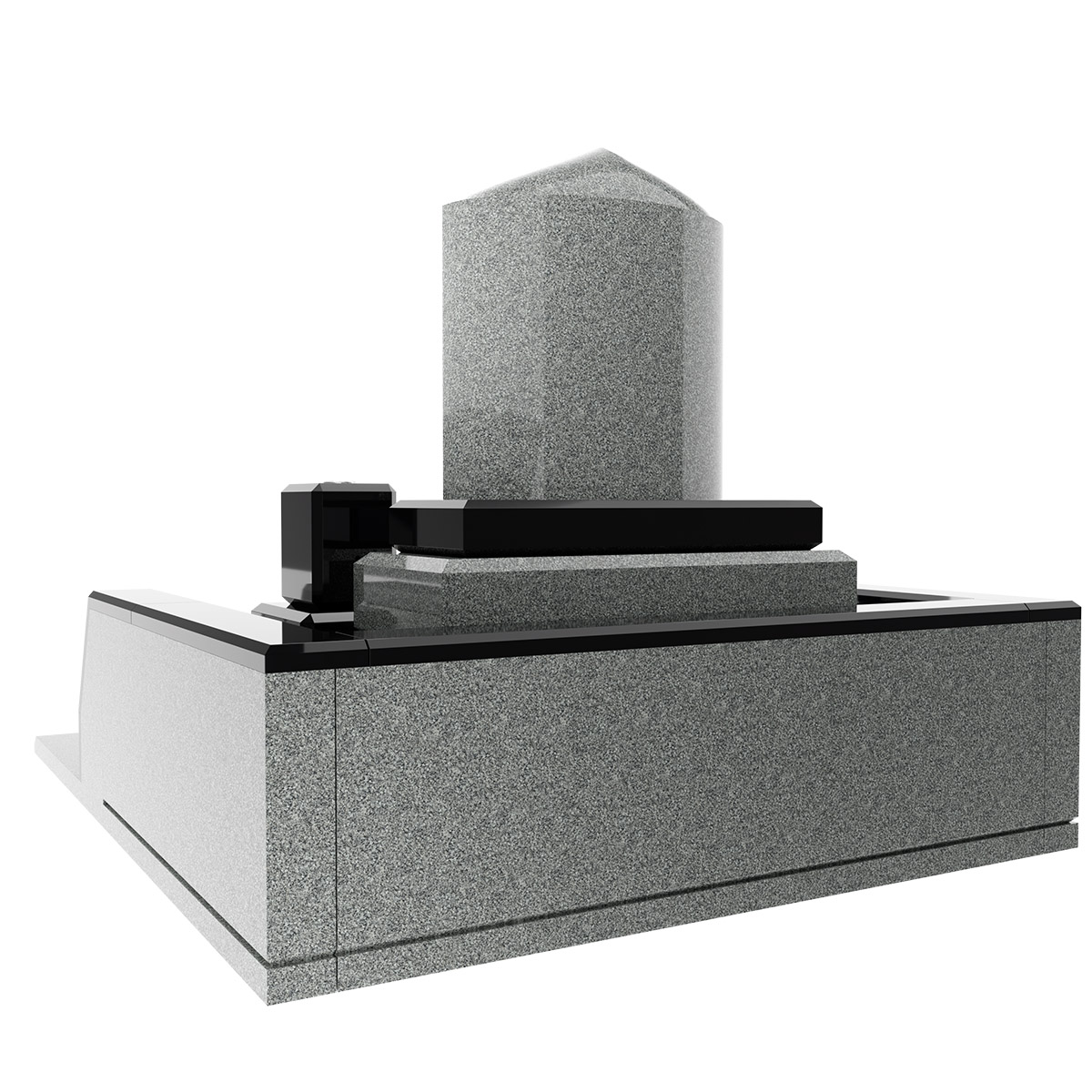 石材はクンナムとインドアーバングレーを使用しています。このデザイン墓石は大胆に斜めに構成されたレイアウトと左右非対称でスタイリッシュなフォルムが特徴。その名が表すように、歓喜と美しさを象徴しています。個性ある墓石をお求めの方におすすめです。