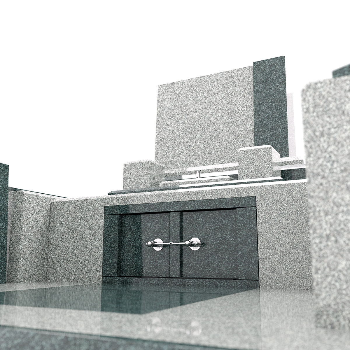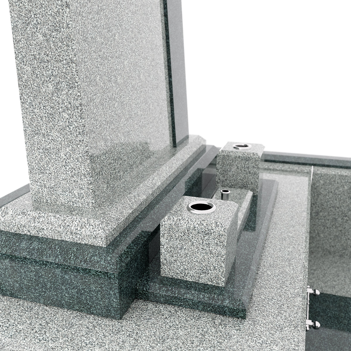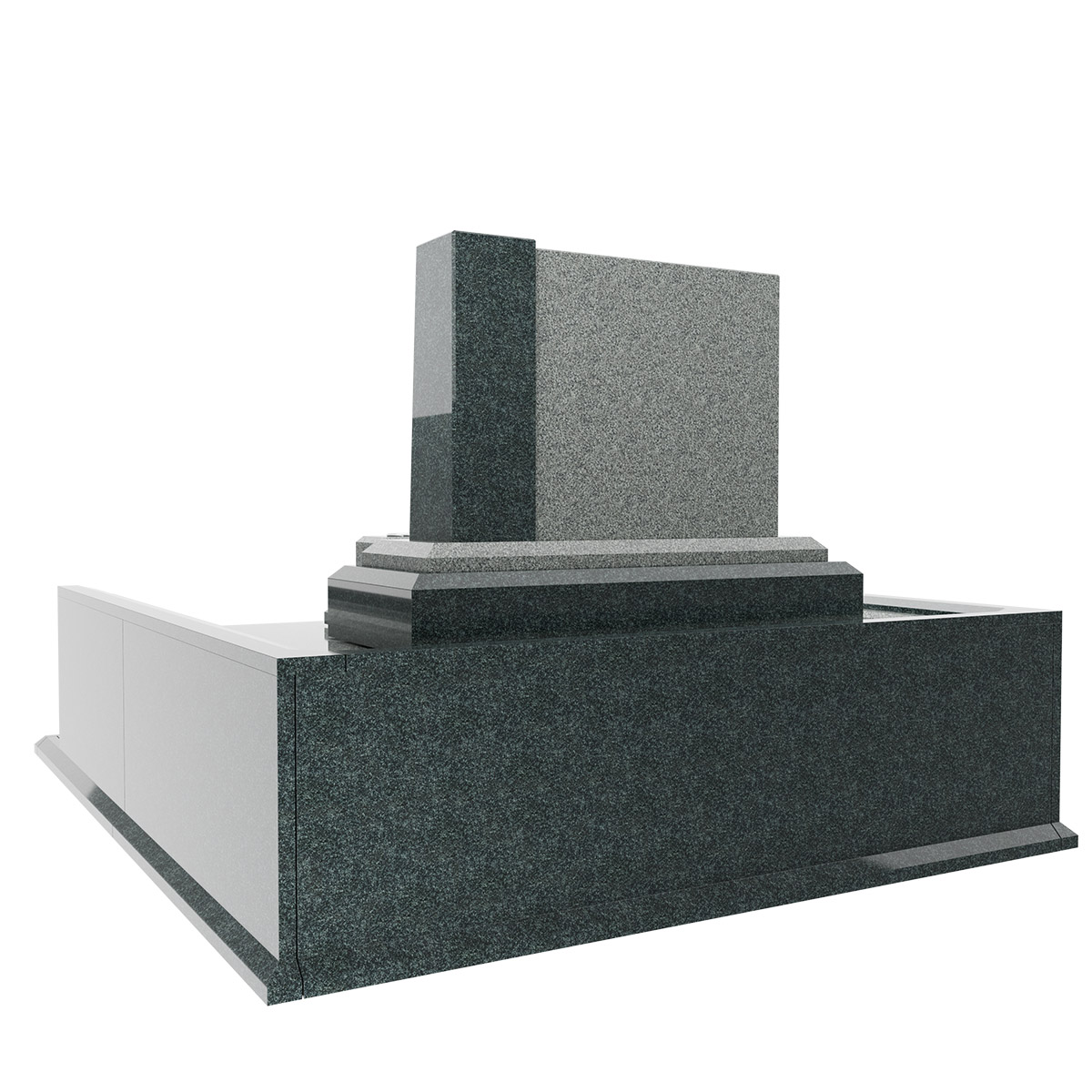 石材はインドアーバングレーとM-1-Hを使用しています。このデザイン墓石はスタンダードなフォルムとシンプルで落ち着きある2トーンカラーが特徴で、その名が表すように至福の安らぎを象徴しています。穏やかな雰囲気とモダンなデザインが調和し、故人様への敬意を表現しています。スタイリッシュでモダンな墓石をお求めの方におすすめです。