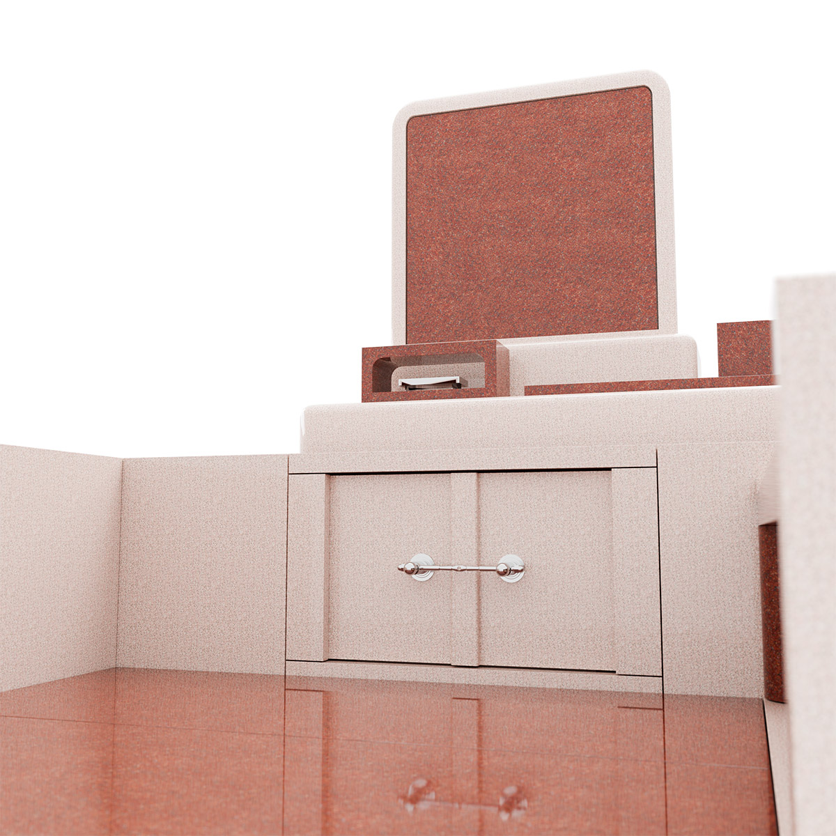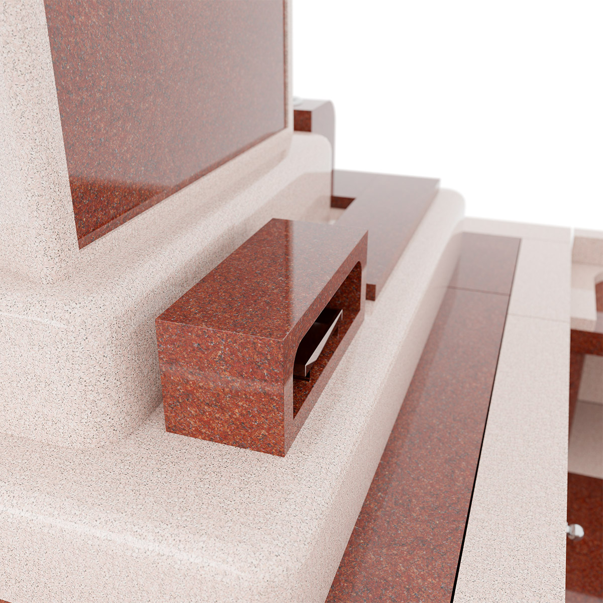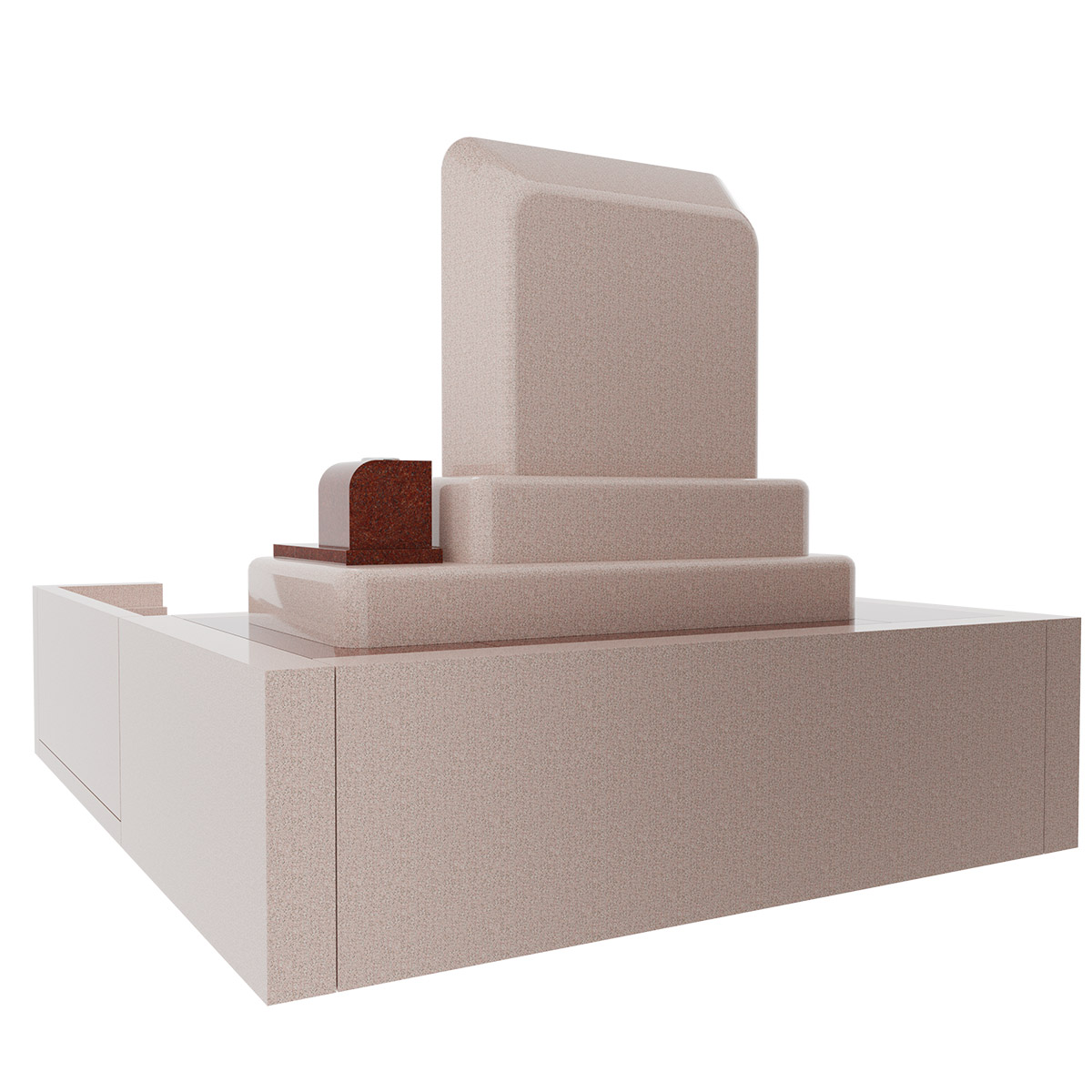 石材はニューインペリアルレッドとインド八重桜を使用しています。このデザイン墓石はシンプルモダンながら赤とピンクの2色の竿石が優雅な美しさを放っているのが特徴です。その名が表すように感謝の気持ちを象徴しています。落ち着きのあるフォルムは墓地に調和し、大きなレイアウトのベンチは、亡き方への感謝と共に、静かに寛ぎの時間を過ごす場を提供します。