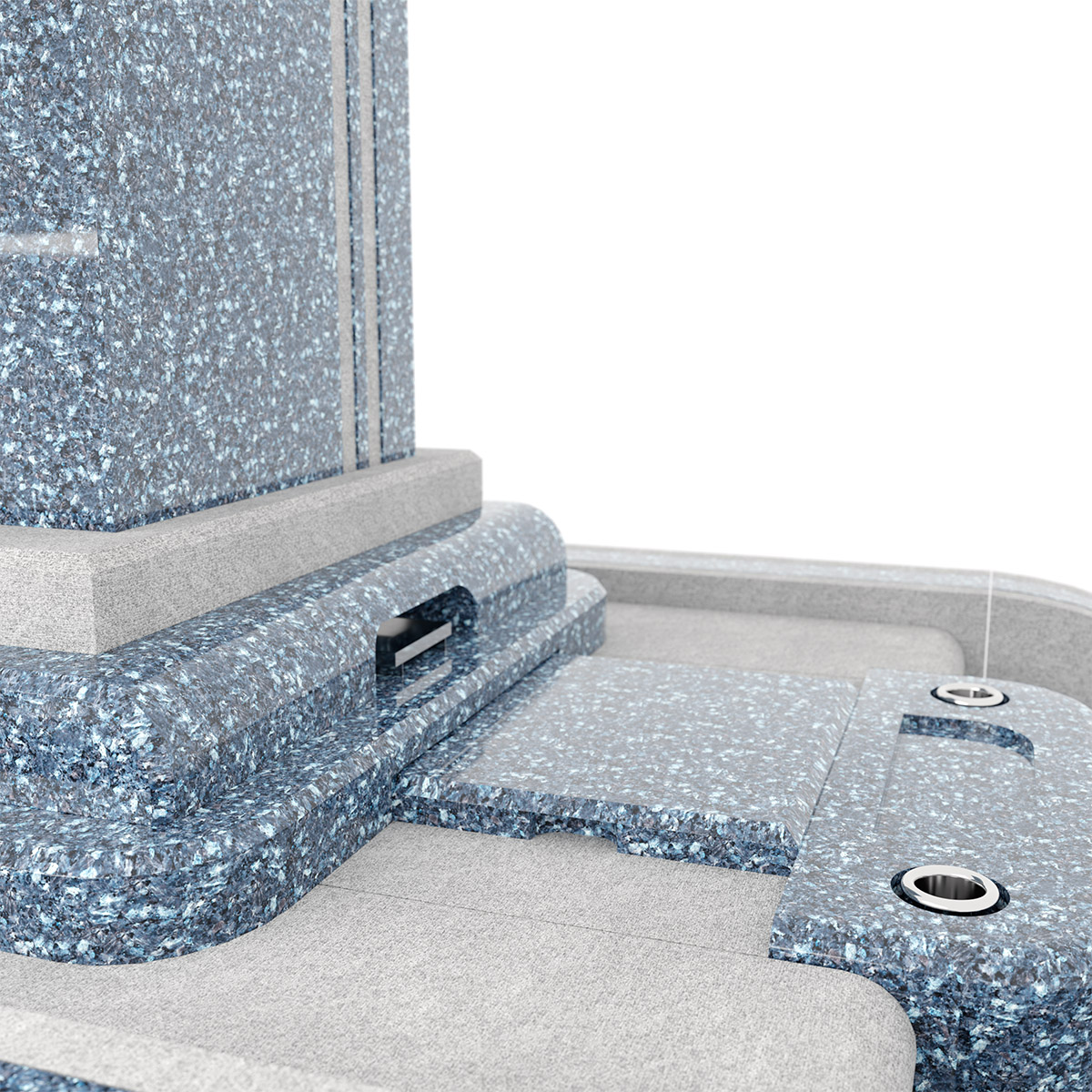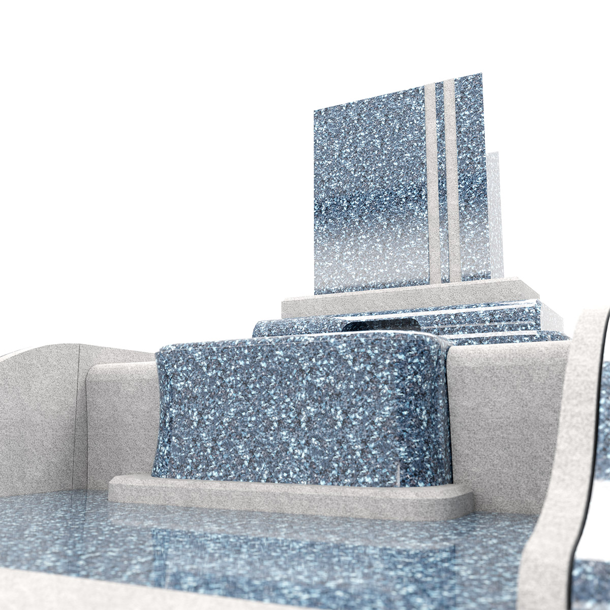 石材はインドアーバングレーとブルーパールを使用しています。このデザイン墓石は喜びを象徴する名のように、外観も明るさと幸せに満ちています。2つの石材でサンドされたゆるやかなスロープ状の外柵と、竿石にあしらわれた2本のラインが特徴。モダンで個性的な墓石をお求めの方におすすめいたします。