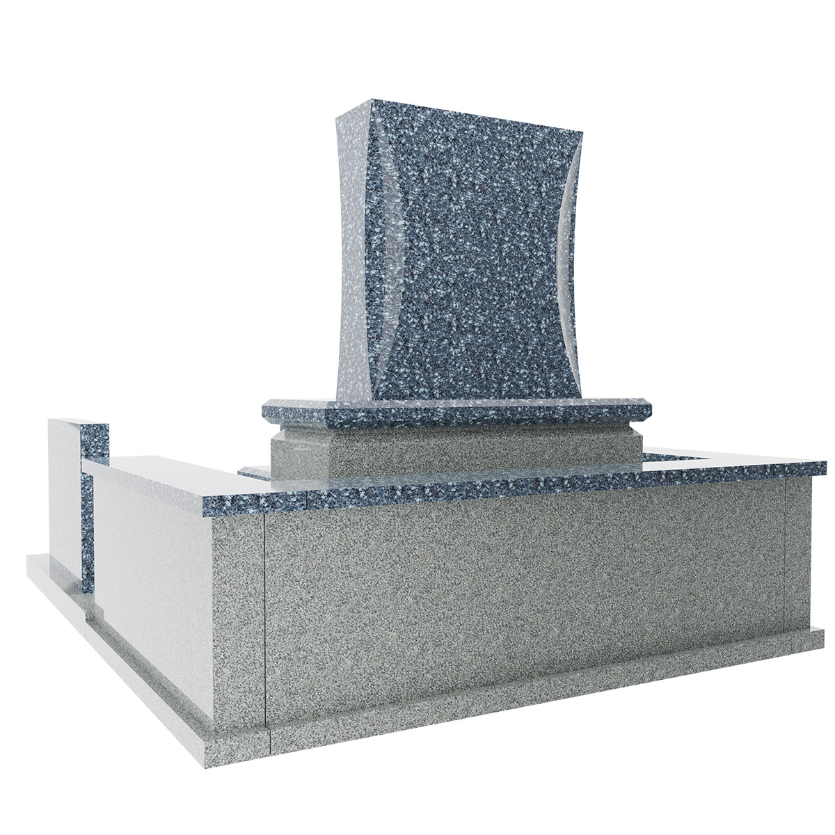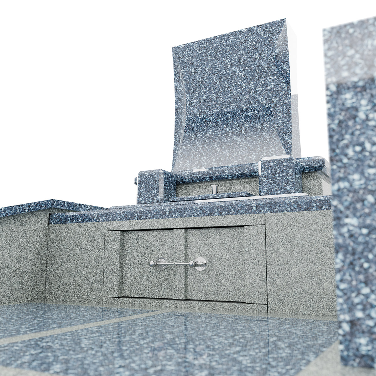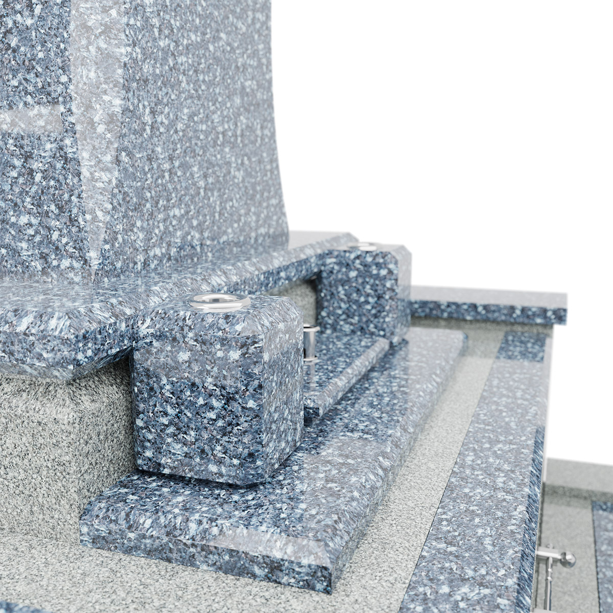 石材はブルーパールとインドアーバングレーを使用しています。このデザイン墓石は大胆に使われた高級石材が特徴です。その名が表すように、人生における奇跡を象徴しています。シンプルながら個性あるフォルムは、落ち着いた風格ながら目を引きます。