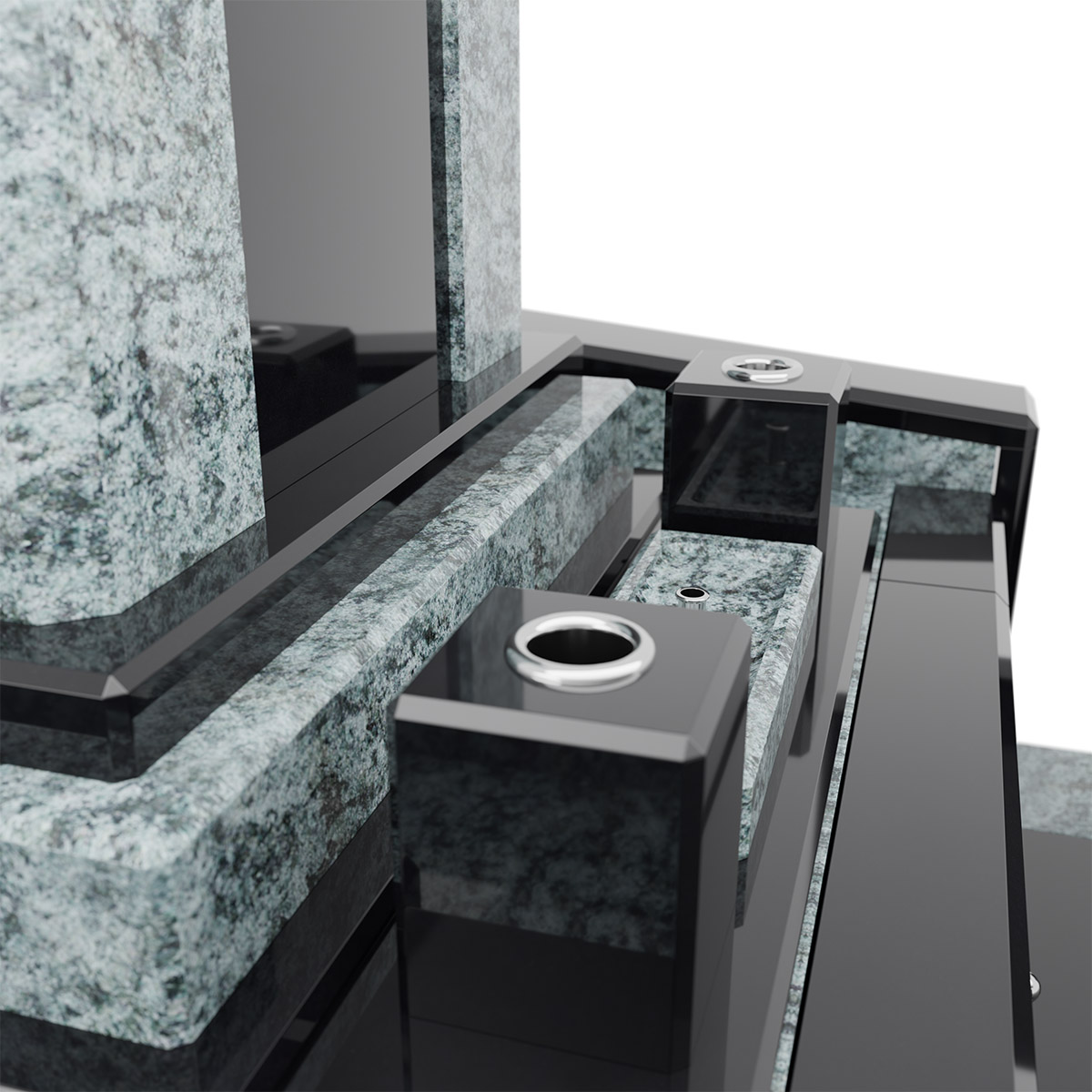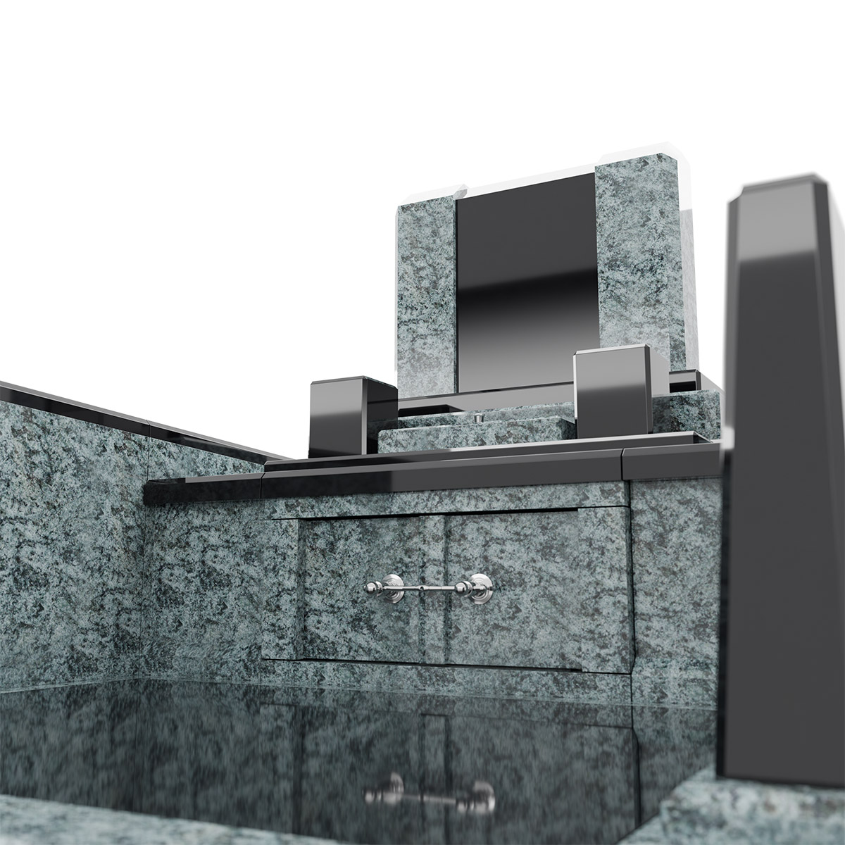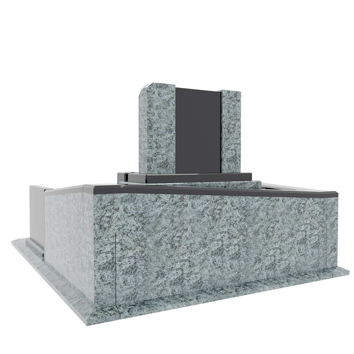 石材はクンナムとオリーブグリーンを使用しています。このデザイン墓石は左右非対称に絶妙な傾斜を持つ外柵が特徴で、その名が表すように穏やかな雰囲気を象徴しています。オリーブグリーンの独特な模様と黒のコントラストが高級感を漂わせ、個性的な美しさを持っています。高級感と個性を兼ね備えた墓石をお求めの方におすすめです。