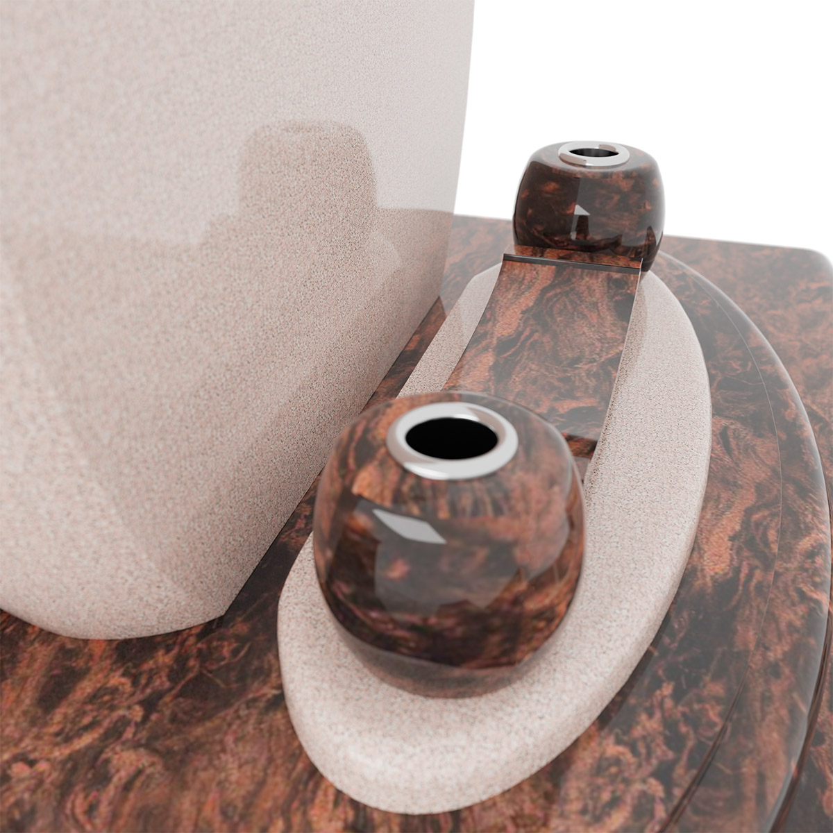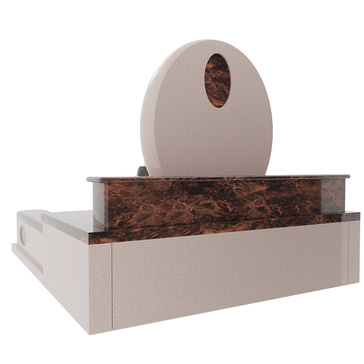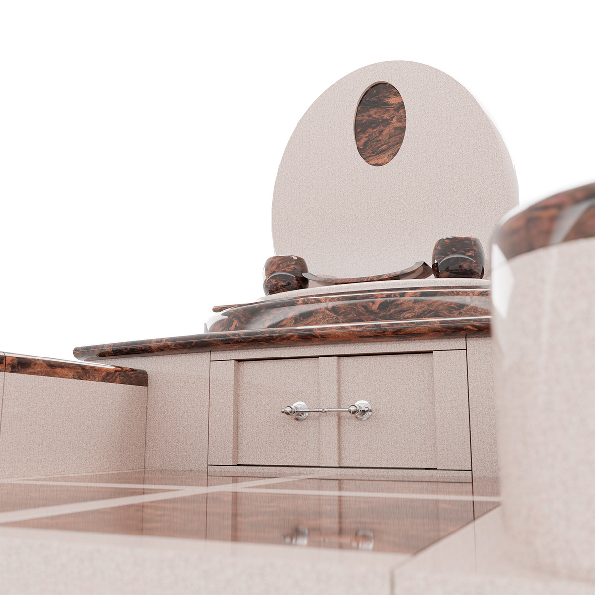 石材はインド八重桜とインドオーロラを使用しています。このデザイン墓石は優しさに包まれた存在感で、その名前の通り「TENDRESSE [タンドレス] – 優しさ」を表現しています。全体的に丸みを帯びた優しいフォルムと、ピンクとブラウンマーブルの美しいコントラストが特徴です。故人様の優しさと暖かさを永遠に刻んだ場所となりますように。