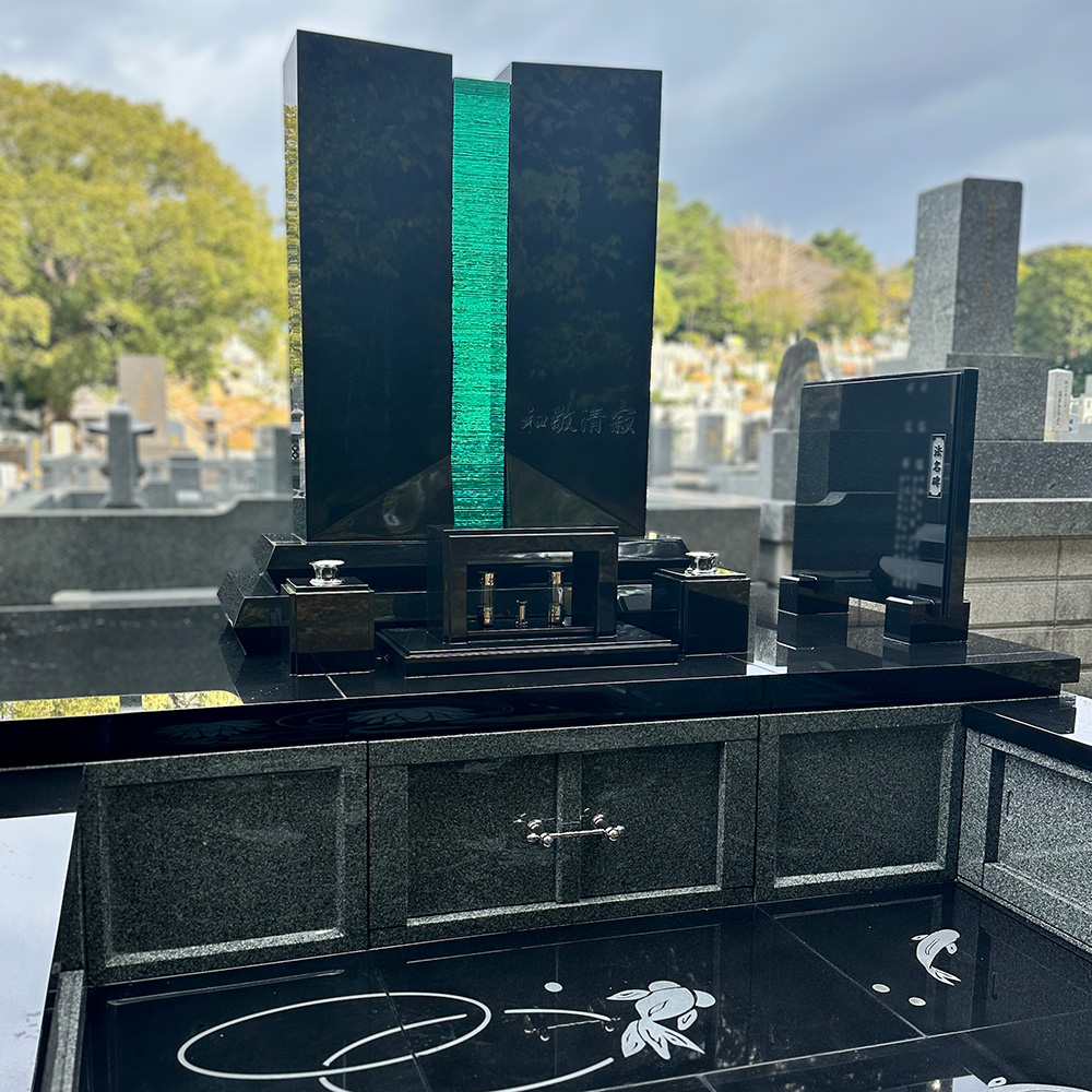 パワーストーンをモチーフとし、アートガラスをあしらえた墓石です。アートガラスは他にも種類がお選びいただけます。アートガラスは光加減や見る角度で様々な美しい表情を見せてくれます。※画像のガラスはあくまでCGイメージです。実際は光の加減や見る角度などで見え方が異なります。