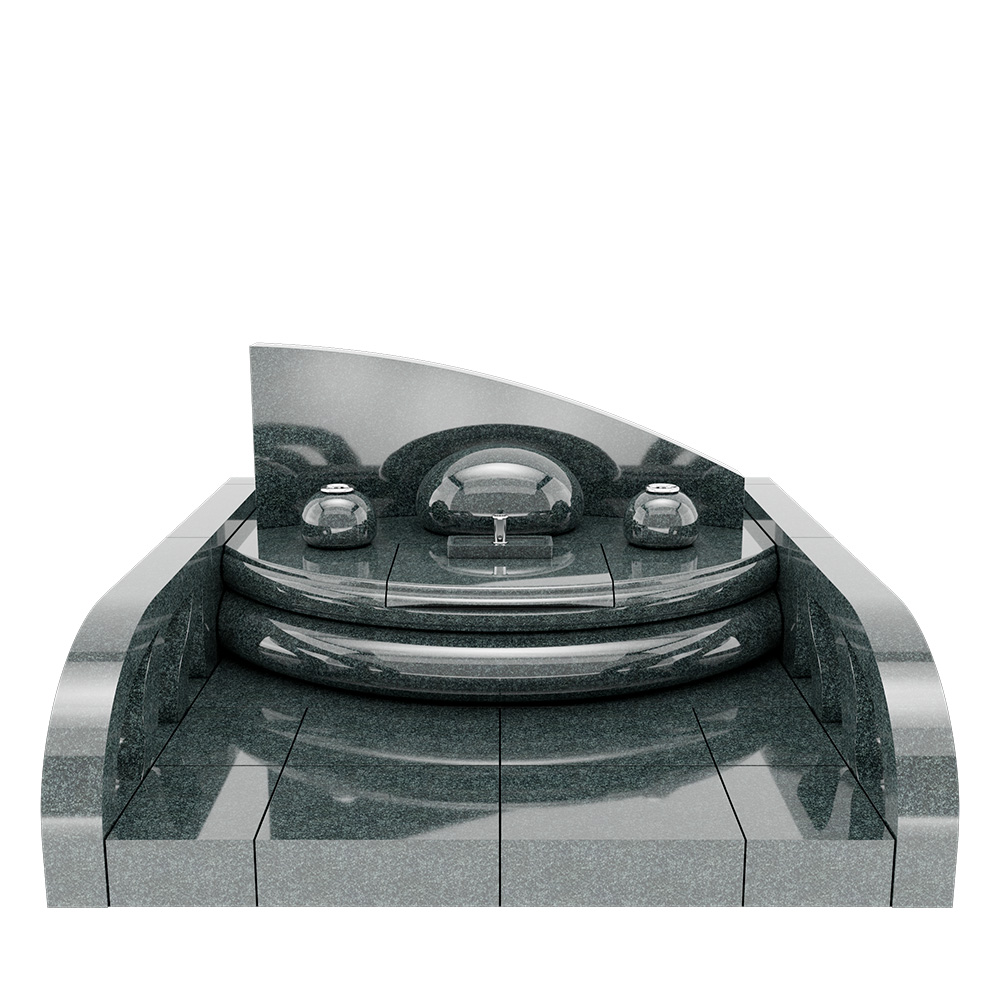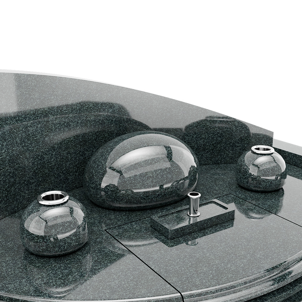 「月涙(LUNA)」は、月の雫をひと粒、石に宿したような墓石。中央の丸い竿石が光を受けて、夜の気配を静かに返します。弧を描く背石は、月の軌道にも、水面に残る輪を彷彿とする造形。アシンメトリーなフォルムは、立つ位置で表情を変え、視線はまたふと中心へ戻っていきます。石材は深い緑の御影石「M1H」。晴れの日は凛と、曇りの日はしっとりと、同じ場所に違う表情を置きながら、故人と寄り添う気持ちをゆっくり整えてくれる、そんな場所となりますように。