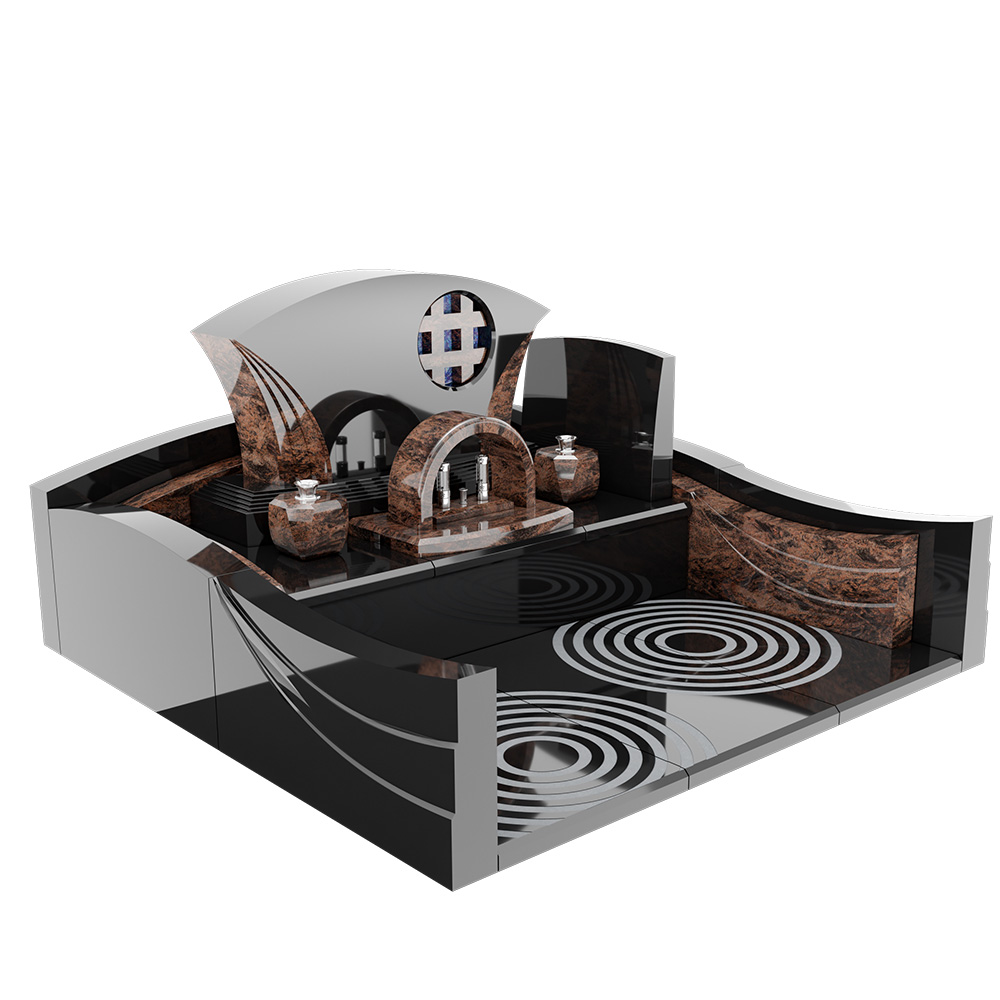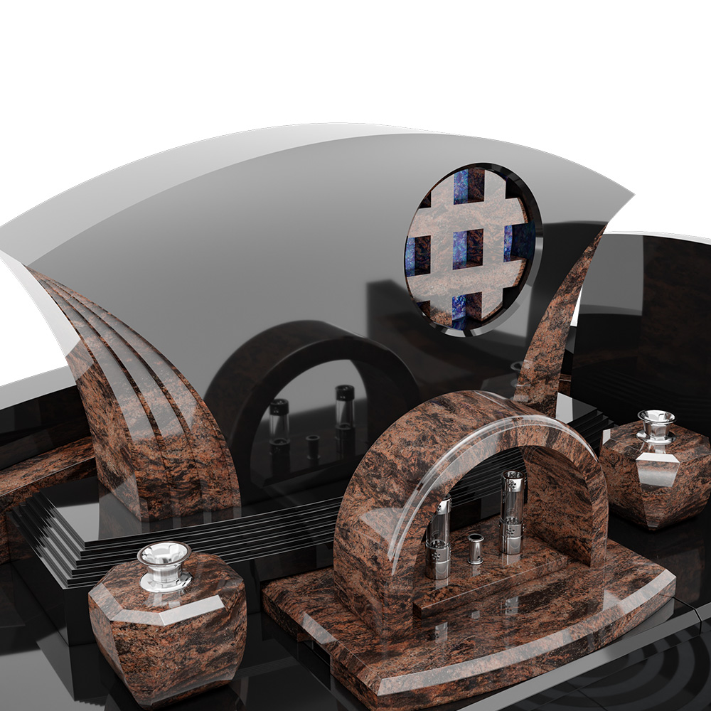 「流光堂[りゅうこうどう]」は、枯山水の庭にたたずむ“庵(いおり)”のように、静けさと品格を大切にしたデザイン墓です。艶やかな黒の床面は、水面のように光と景色を映し込み、訪れる方の心をすっと落ち着かせます。水紋をモチーフとした同心円の意匠は、祈りの場に穏やかな余韻を広げてくれるでしょう。大きく弧を描く竿石と、左右へ流れる外柵の曲線が全体をやさしく包み込み、まるで庭園の一景を切り取ったような佇まいに。竿石にはブルーのアートガラスをあしらい、清澄なアクセントを添えました。石材には高品質なクンナムとオーロラを使用。黒の艶と豊かな表情が調和した、和の情景を現代的に昇華したデザインです。