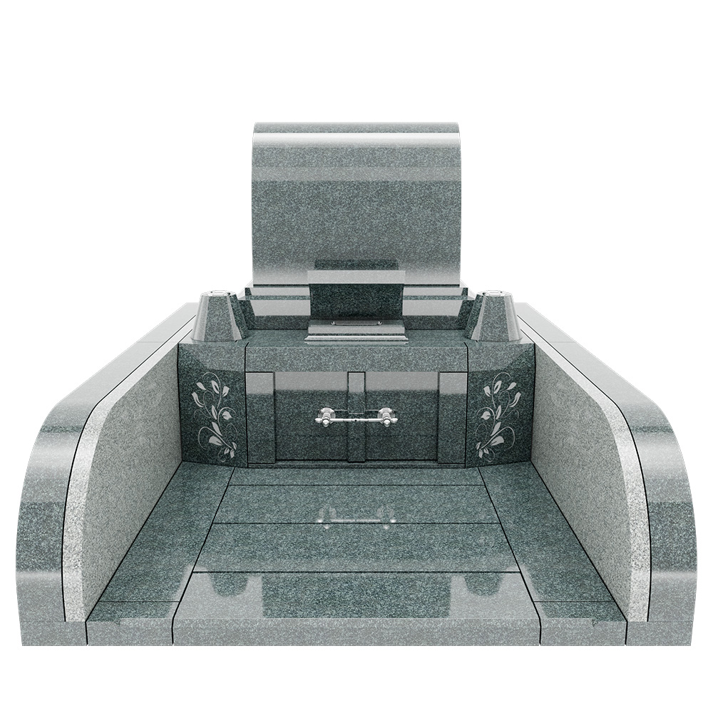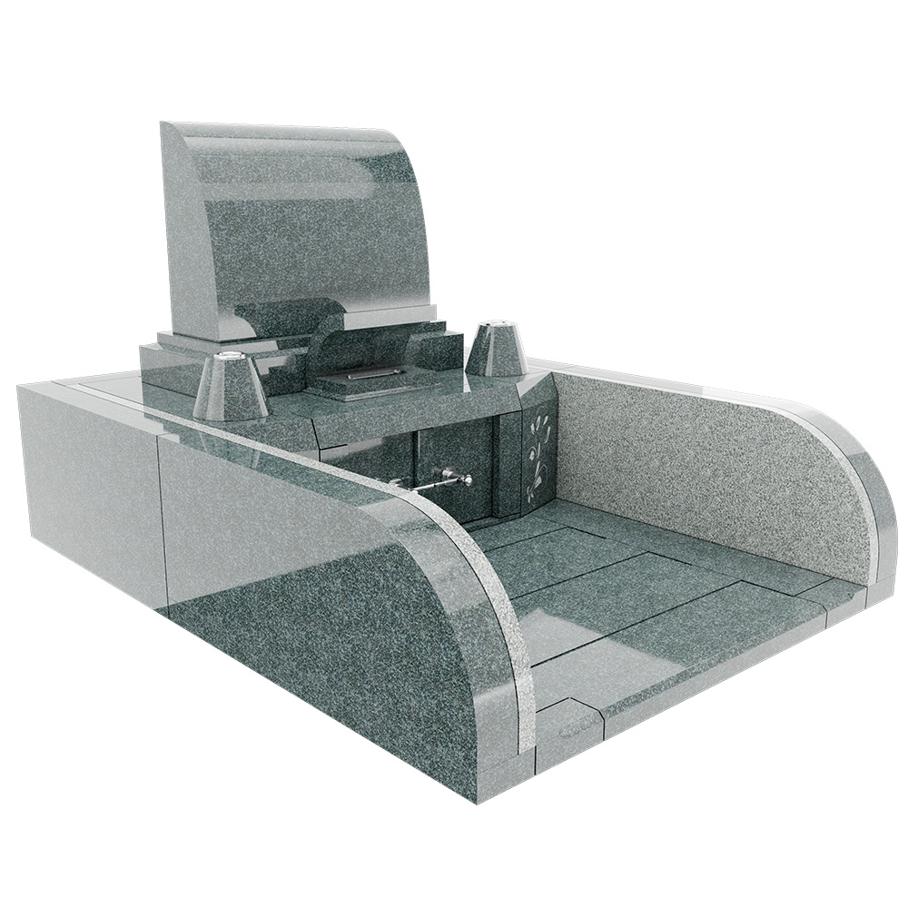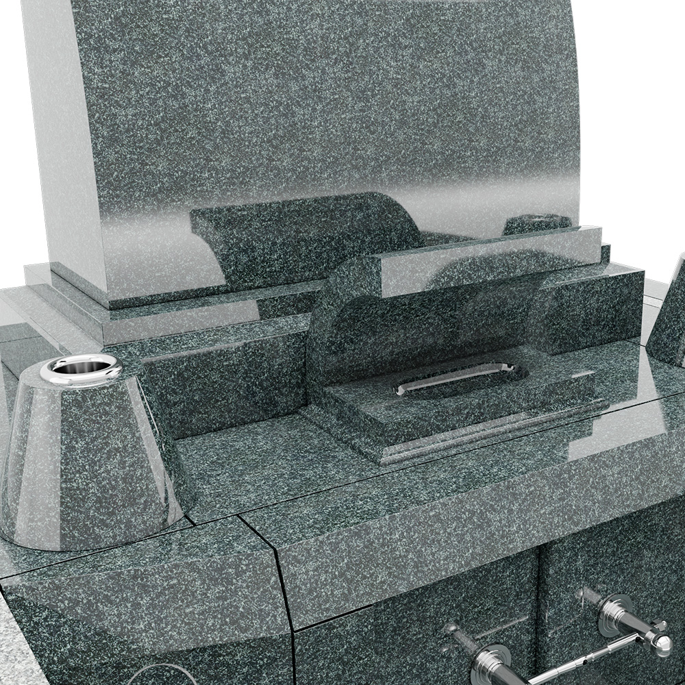 「月光」は端正で気品高い面持ちがポイントのデザイン墓です。深い緑の御影石M1Hを基調に、国産稲田石の明るいトーンをあしらい、バランスの良い奥行きをつくりました。左右の面に添えた草花の彫刻は、さりげないアクセントとして空間を和ませます。落ち着いた佇まいの中に、訪れる人の心が一段とやすらぎますように。